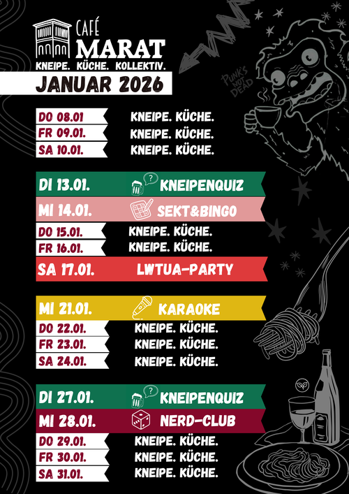 Auch im Januar hat unser gemütliches Café Marat wieder für euch geöffnet – mit unseren beliebten Formaten: Das Kneipenquiz, Sekt & Bingo, Karaoke und dem Nerd-Club heizen wir der kalten Jahreszeit so richtig ein. Wie immer erwarten euch liebevoll gekochte vegane und vegetarische Speisen, gute Drinks und entspannte Stimmung mitten in der KTV Rostock.
