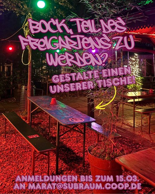 Melde dich gern per Mail an Marat@subraum.coop oder per DM bei uns, Anmeldefrist ist bis zum 15.03 um 18 Uhr.