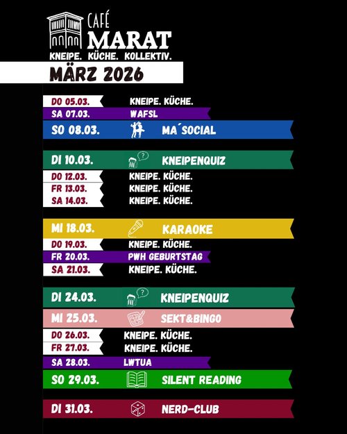Auch im Februar hat unser gemütliches Café Marat wieder für euch geöffnet – mit unseren beliebten Formaten: Das Kneipenquiz, Sekt & Bingo, Karaoke und dem Nerd-Club. Wie immer erwarten euch liebevoll gekochte vegane und vegetarische Speisen, gute Drinks und entspannte Stimmung mitten in der KTV Rostock.