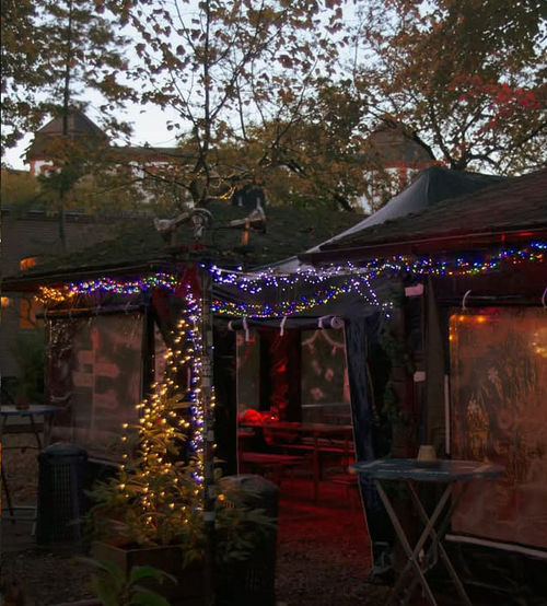 Unter überdachten Pavillons mit Heizstrahlern, Lichterketten und Sitzkissen kannst du bei uns bei jedem Wetter draußen verweilen. Mit dampfendem Glühwein, heißem Birnensaft mit Zimt & Sahne oder einer warmen Suppe in der Hand lässt sich die eisige Jahreszeit bei uns gut aushalten.